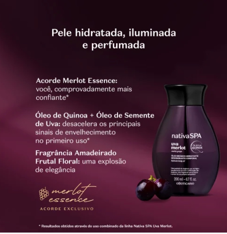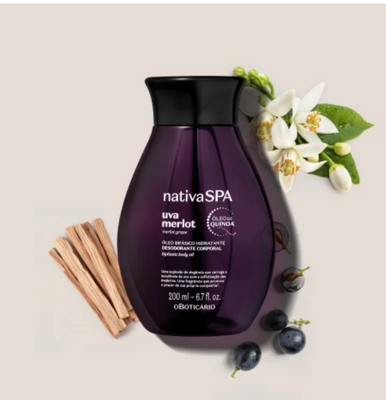 Nativa Spa O Boticário te invita a experimentar su máxima potencia al disfrutar de este encuentro a solas contigo misma, acompañada de Nativa Spa Uva Merlot. Una fragancia magnética y envolvente que promueve la confianza¹ con el exclusivo Acorde Merlot Essence. Nativa Spa es la primera marca³ del mundo que utiliza aceite de quinoa para estimular la producción de colágeno en la piel.