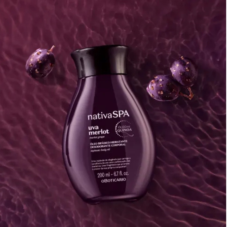 El Aceite Bifásico Hidratante Desodorante Corporal Nativa Spa Uva Merlot proporciona una increíble textura sensorial para su momento extraordinario, creando una película hidratante mientras perfuma la piel, recuperando un tiempo que siempre ha sido suyo.
