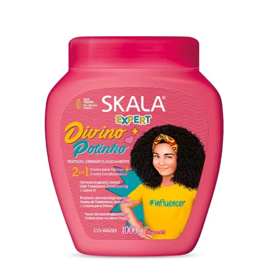 “Divino Potinho” de Skala es una línea de cremas para el cabello diseñada para hidratar, desenredar y definir rizos, especialmente en niños, aunque también es apta para adultos. Contiene ingredientes como manteca de karité, aceite de coco y aceite de linaza, y es 100% vegana, libre de sulfatos, siliconas y petrolatos. Se puede usar como crema para peinar (sin enjuague), acondicionador (con enjuague) o mascarilla de tratamiento.